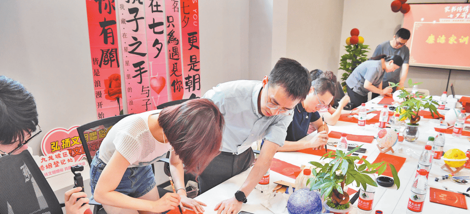 九龙坡区“家庭廉课堂”活动现场,新组成家庭的党员干部及家属现场书写廉洁家训。