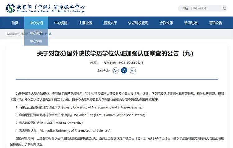10月28日,中国教育部留学服务中心(中留服)发布《关于对部分国外院校学历学位认证加强认证审查的公告(九)》,决定对4所海外院校的相关认证申请启动加强审查程序。