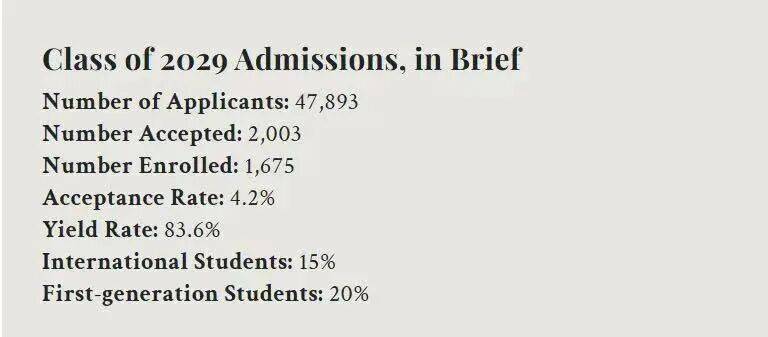 近日,哈佛大学2029届新生数据已公布。数据显示,哈佛大学共收到47,893份申请,录取2,003人,最终1,675人入学,录取率为4.2%,较2028届的3.6%有所上升。入学率为83.6%,连续五年保持在83%以上,国际学生入学率达90.3%(仅8人延期)。