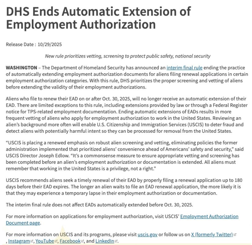 10月29日,美国国土安全部(DHS)宣布,自10月30日起终止EAD(就业授权文件)自动续期政策。