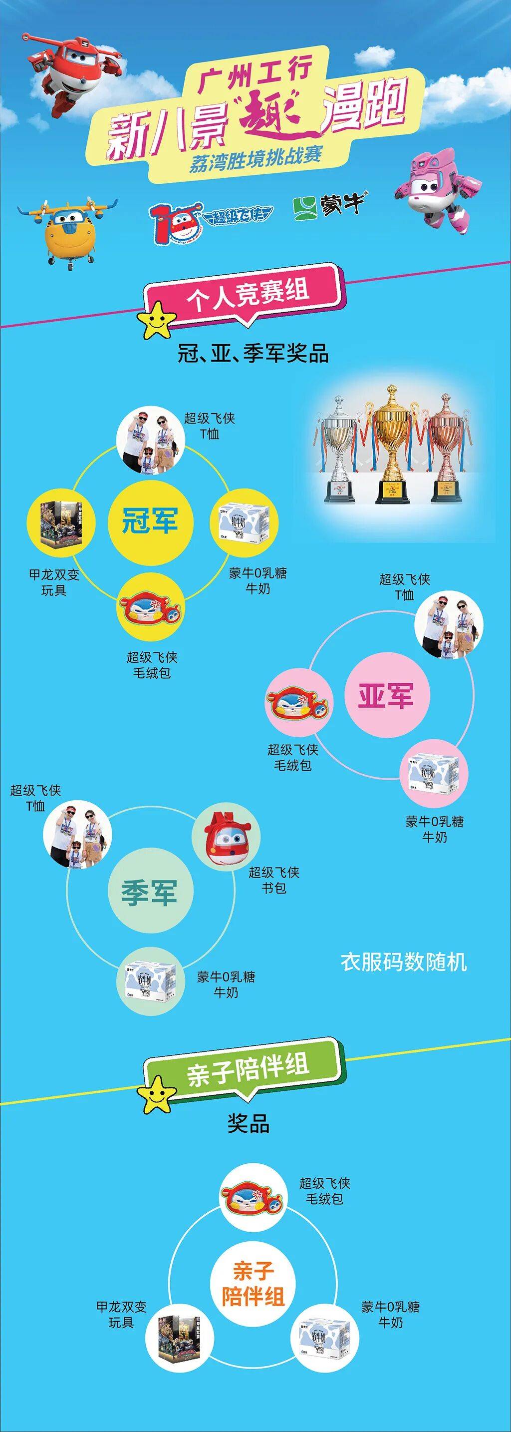 冠亚季军将获得超级飞侠T恤、毛绒包、书包、甲龙双变玩具、蒙牛0乳糖牛奶及定制奖杯;