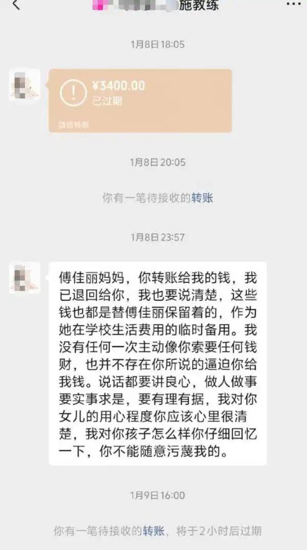 如果说体罚和辱骂是对傅佳丽身心的直接伤害,那么教练的索财行为,则是从经济上对她和她的家庭进行无情的压榨。自 2023 年 1 月起,唐琰和施佳就开始以各种理由,向傅佳丽的家属索要财物。