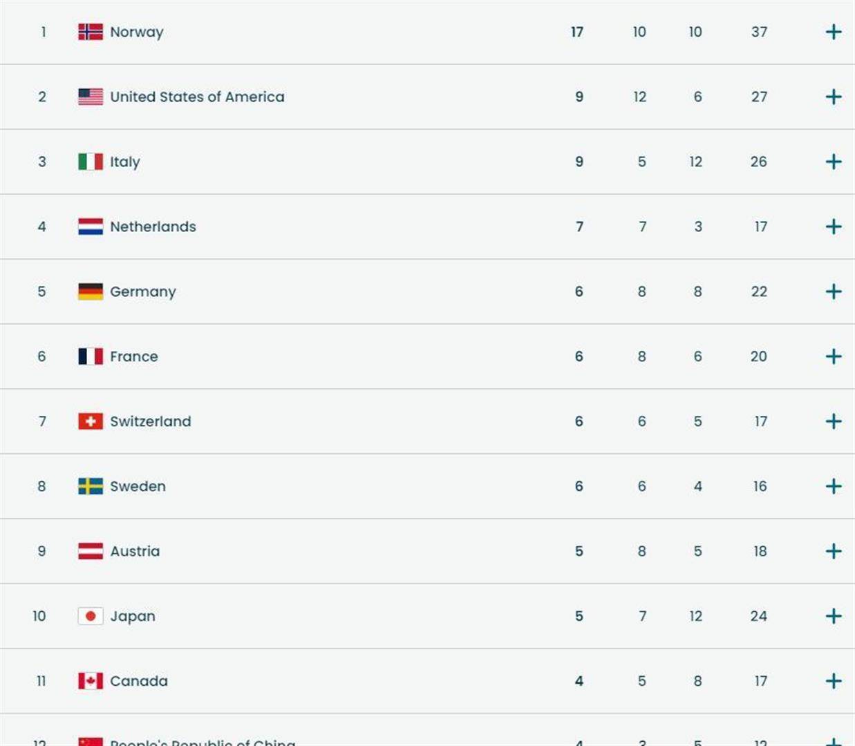 2022年北京冬奥会,中国凭借主场优势以9金15枚奖牌位列奖牌榜第三,创造了历史最佳战绩。 本届米兰冬奥会,是中国巩固“冰雪强国”地位、在海外赛场证明自己的关键一役。 从最新的奖牌榜总排名来看,截至2月21日,挪威代表团以17金10银10铜,总计37枚奖牌的绝对优势领跑。 美国队以10金12银9铜排名第二,东道主意大利队以9金5银12铜位列第三。