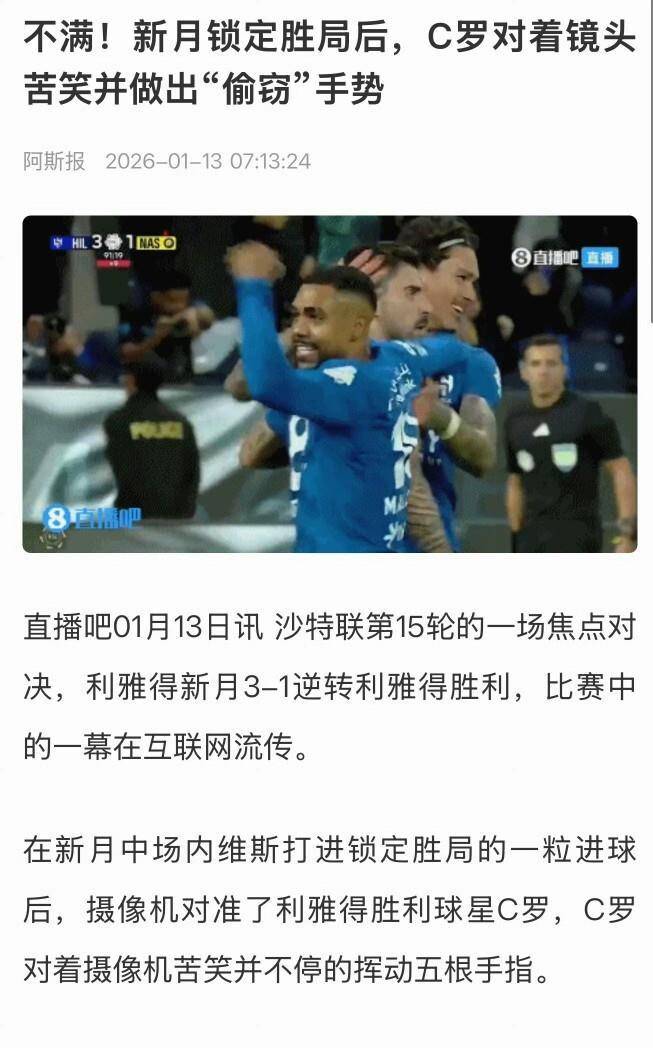 屋漏偏逢连夜雨,比赛第74分钟,C罗在前场拼抢中疑似被对手打脸倒地,但主裁对此没有任何表示。 更致命的打击在第90分钟到来,主裁再次指向点球点,利雅得新月凭借这粒点球反超了比分。 最终,利雅得新月中场内维斯打入锁定胜局的一球,将比分定格在3-1。 遭遇逆转的利雅得胜利吞下了联赛三连败,与榜首的积分差距被拉大,争冠希望变得渺茫。 正是在终场哨响前后,镜头捕捉到了替补席上C罗那标志性的五指手势,西班牙媒体解读,这是他表达“比赛被偷窃”的不满方式。