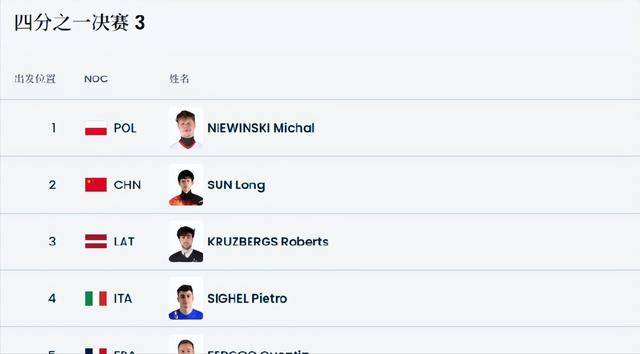 孙龙第三组,对手意大利西盖尔,孙龙预赛1分25秒339,这是中国选手本赛季男子1000米最快成绩,他预赛最后一圈在最后一个弯道从内线秒过线,终点摄像头显示刀刃先压线。